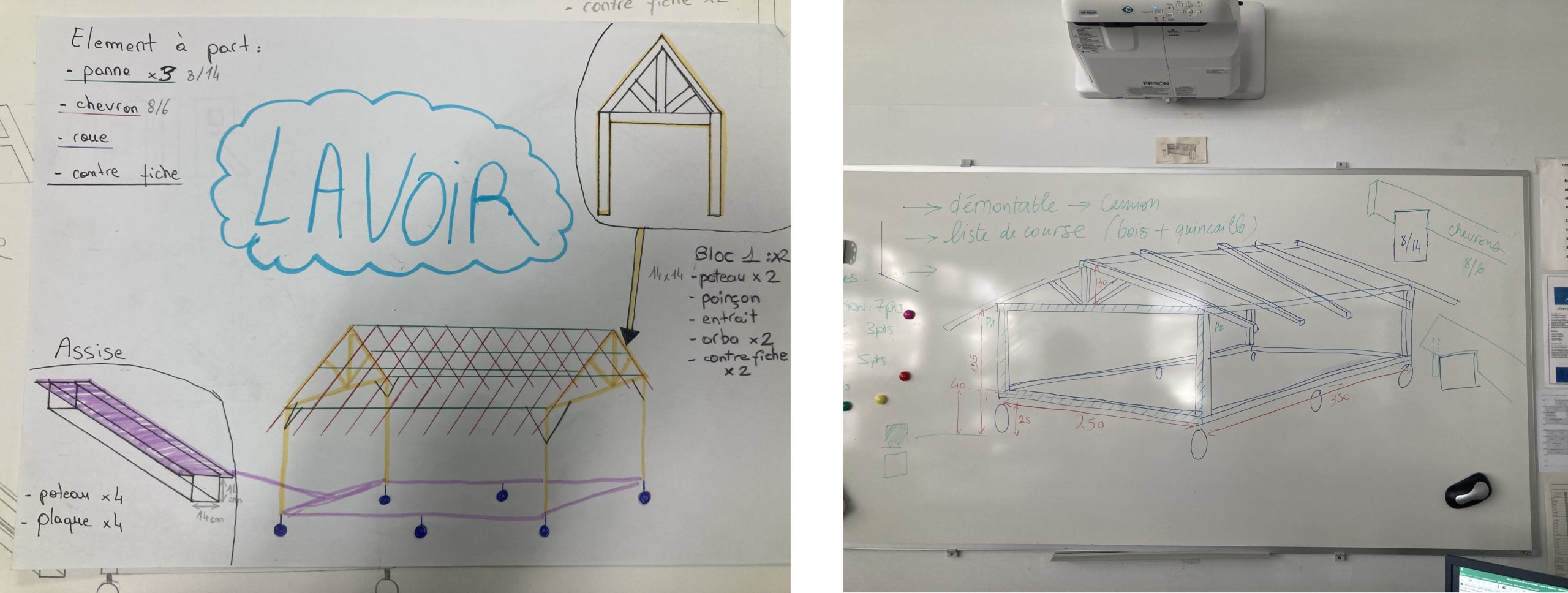 À partir des techniques de charpente, les élèves construisent une structure bois qui s’inspire des architectures des anciens lavoirs – ces lieux autrefois animés par les voix des femmes, par la répétition des gestes, par la vie communautaire. Si leur fonction initiale s’est perdue, ces constructions demeurent dans les villages comme autant de témoins silencieux. Certains deviennent des abris, des coins d’ombre, des points de rencontre pour les jeunes générations. En s’inspirant de cette métamorphose des usages, l’œuvre réalisée devient un lieu propice aux échanges, aux confidences, à la convivialité. À travers ce travail, les élèves donnent forme à une mémoire collective, tout en l’inscrivant dans un présent réinventé.