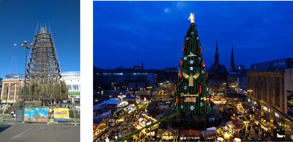 Le Centre de Formation BZ Hansemann à Dortmund, implanté sur le site d’une ancienne mine de charbon, est le plus grand centre européen de formation pour les échafaudages.Les échafaudages sont omniprésents, en extérieur et en intérieur, qu’ils soient montés…… ou bien entreposés. Le centre dispose de 25 000 tonnes d’équipements !Les visiteurs se sont aussi rendus sur un autre site, situé à Soest, où diverses formations sont dispensées par cet établissement, certaines nous étant familières.Anecdote intéressante : Dortmund détient le record mondial officieux du plus grand sapin de Noël présenté chaque année. En réalité, il s’agit d’une structure réalisée en échafaudages (voir photo de gauche) sur laquelle sont fixés un millier de sapins. Effet garanti pour une hauteur d’environ 45 mètres !Comment joindre l’utile à l’agréable : un petit tour dans la ville de Soest pour voir quelques curiosités locales.