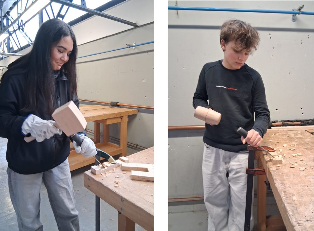 Même si chaque élève fabrique sa propre pièce, il n’est pas interdit de s’entraider (ci-dessus à gauche), bien au contraire, et la bonne humeur n’empêche pas de travailler (ci-dessus à droite).