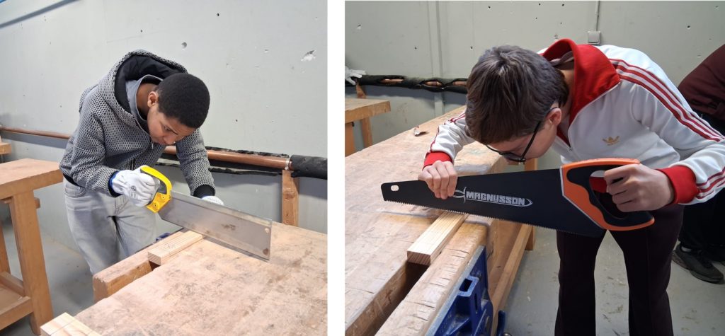 Deuxième opération et première prise en main d’un outil : le sciage (ci-dessus). Il ne s’agit pas de couper entièrement les pièces, mais uniquement d’atteindre la profondeur nécessaire pour la réalisation d’une encoche. On note la grande concentration des jeunes à l’œuvre !